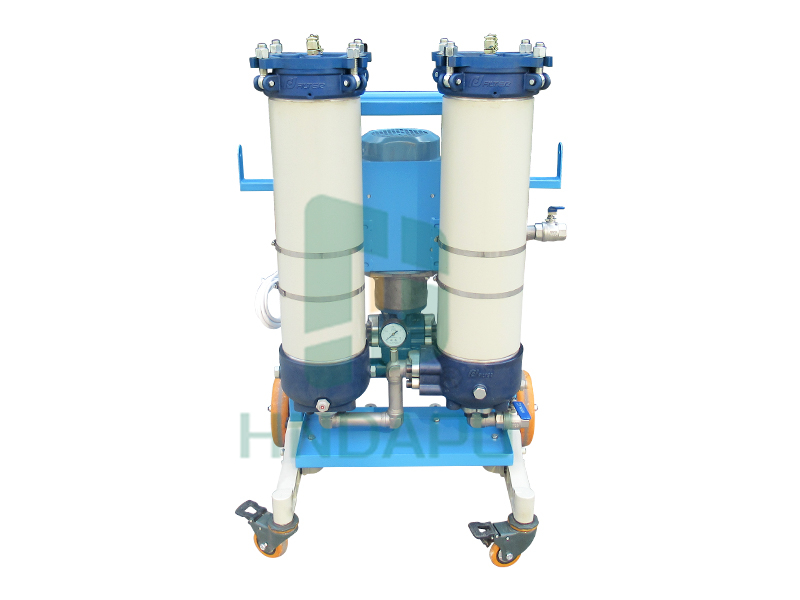 油液在注入系統(tǒng)前必須經(jīng)過凈化,未經(jīng)凈化的新油其污染度往往超過實(shí)際液壓系統(tǒng)油液規(guī)定的要求。即使是剛從油罐中抽取的新油也不適合直接使用,造成新油污染的原因是多方面的,各種污染物,包括顆粒、水分都有可能在加工、混合和儲存過程中混入新油中。移動式濾油機(jī)是一種預(yù)過濾并為系統(tǒng)注油及凈化系統(tǒng)油液的理想方法。油液中的游離水分可通過出口過濾器中安裝的脫水濾芯除去。脫水濾芯是由與水有很高結(jié)合力的高吸水樹脂制成。游離水一旦接觸此材料即被吸附。